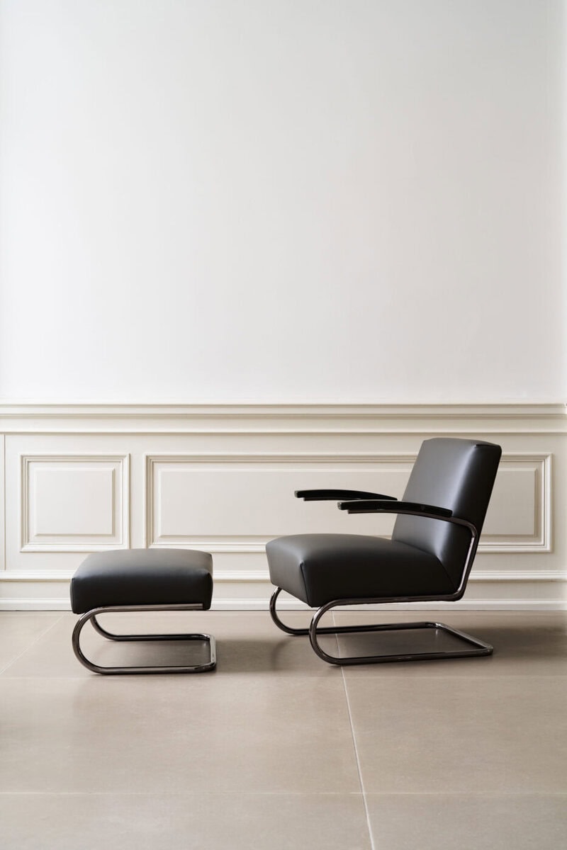 Besonders überzeugend ist, wie konsequent sich diese Haltung über die verschiedenen Produkttypen hinweg fortsetzt. Der Freischwinger S 64 und sein armlehnenloses Pendant S 32 schärfen den Bauhaus-Klassiker über Oberfläche, Glanzgrad und Materialkombination. Der Loungesessel S 411 übersetzt die Sprache der Kollektion in ein weicheres, voluminöseres Sitzmöbel, dessen geschwungenes Stahlrohrgestell auf eine bewusst reduzierte, monolithisch wirkende Polsterung trifft. Der Tisch S 1070 ergänzt die Reihe um einen formal zurückhaltenden Entwurf, dessen längs geteilte Tischplatte zusätzliche Leichtigkeit erzeugt und differenzierte Farbkombinationen erlaubt. Der Beistelltisch B 97 schliesslich nimmt die Material- und Farbwelt der Kollektion auf und verbindet sie mit der funktionalen Raffinesse eines vielseitigen Satztisches.